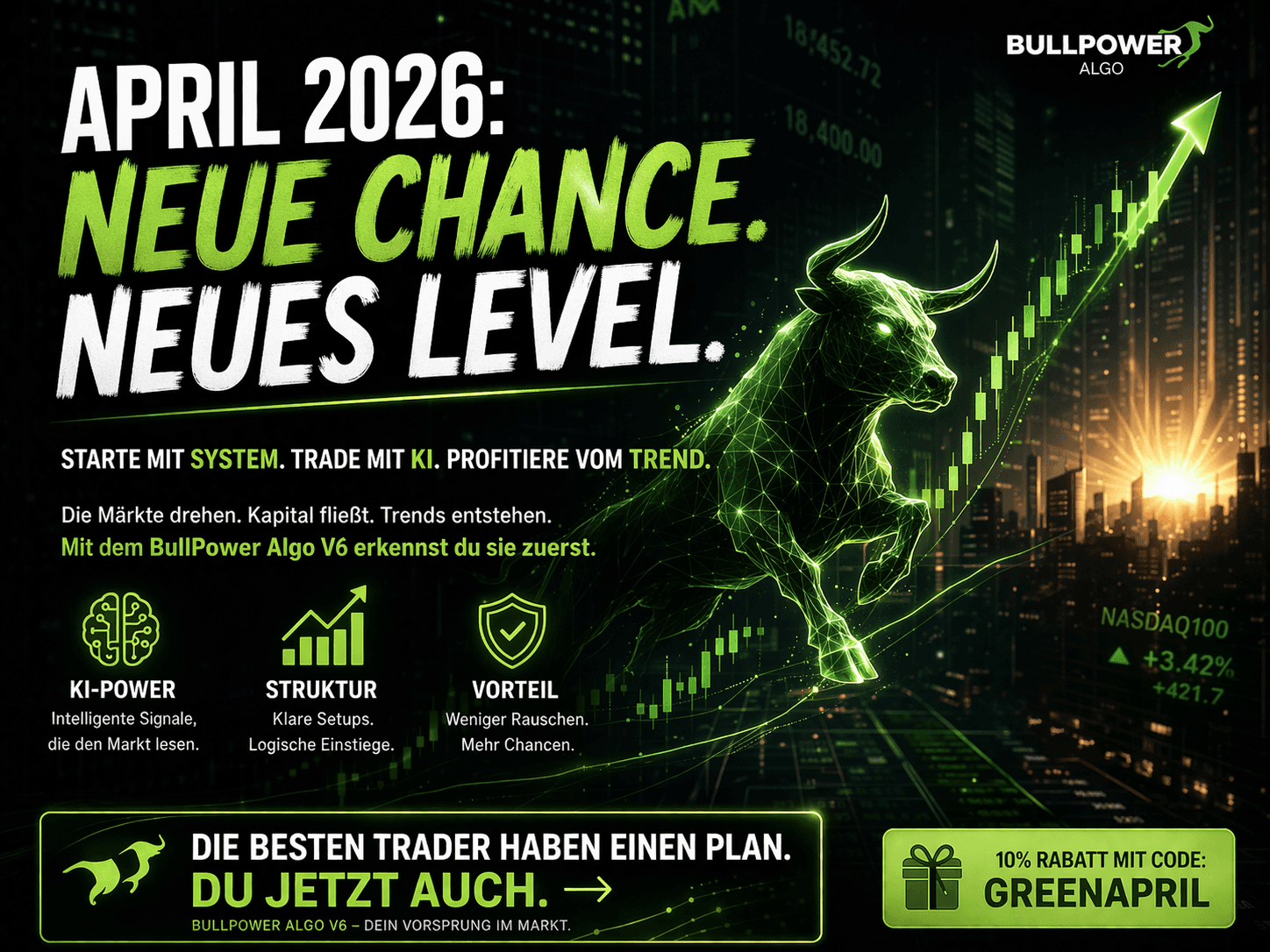 April 2026: Die Märkte drehen, bist du bereit? Trade mit KI.