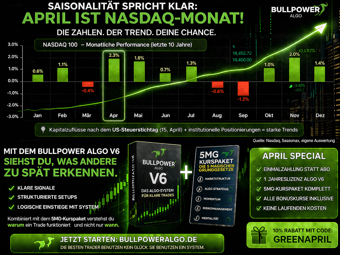April gilt historisch als einer der stärksten Börsenmonate. Sichere dir exklusiven Zugang zu einem KI-gesteuerten Indikator, der dir in jedem Markt - Krypto, Aktien und Forex - einen entscheidenden Wettbewerbsvorteil verschafft.
